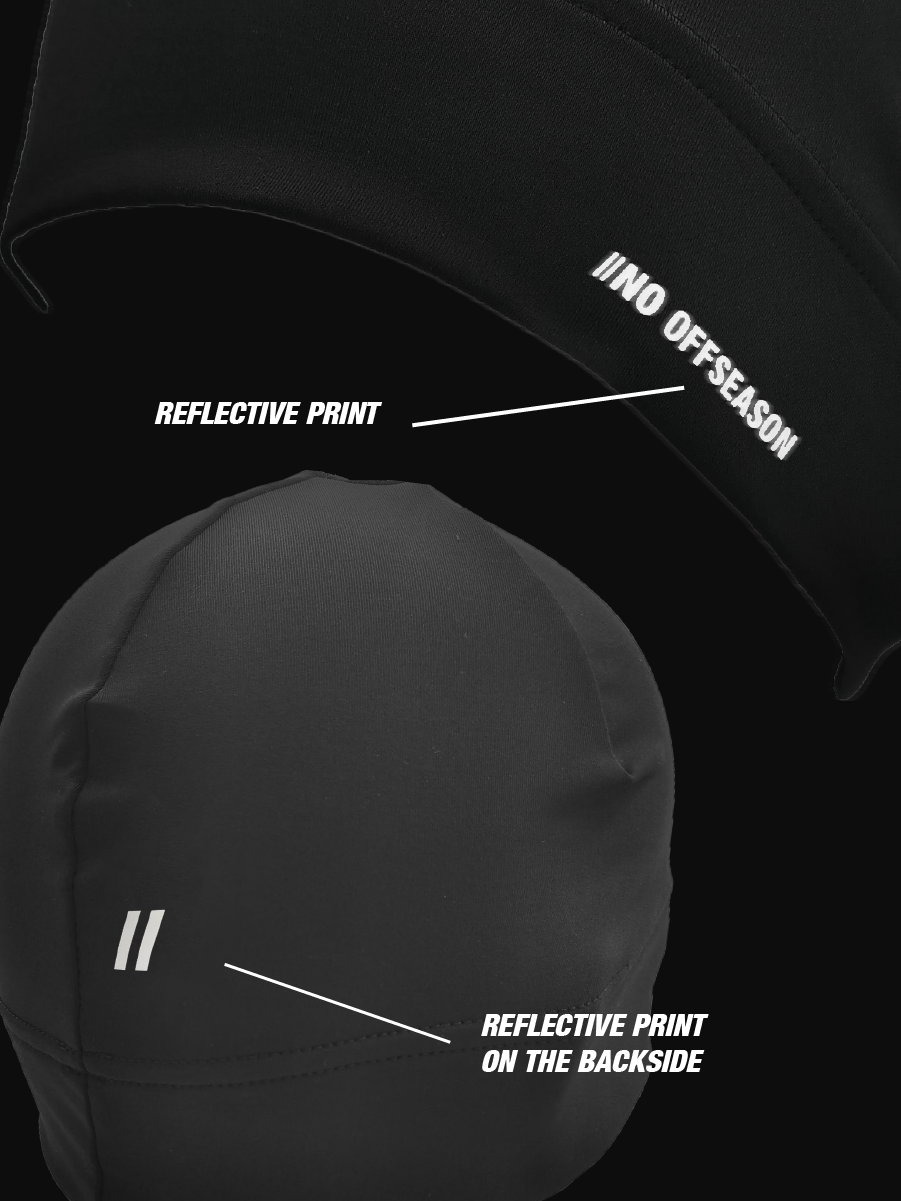 The PERFORMANCE BEANIE is breathable and not too thick or too thin. It is simple and timeless, with a small reflective print on the side and back for greater visibility.